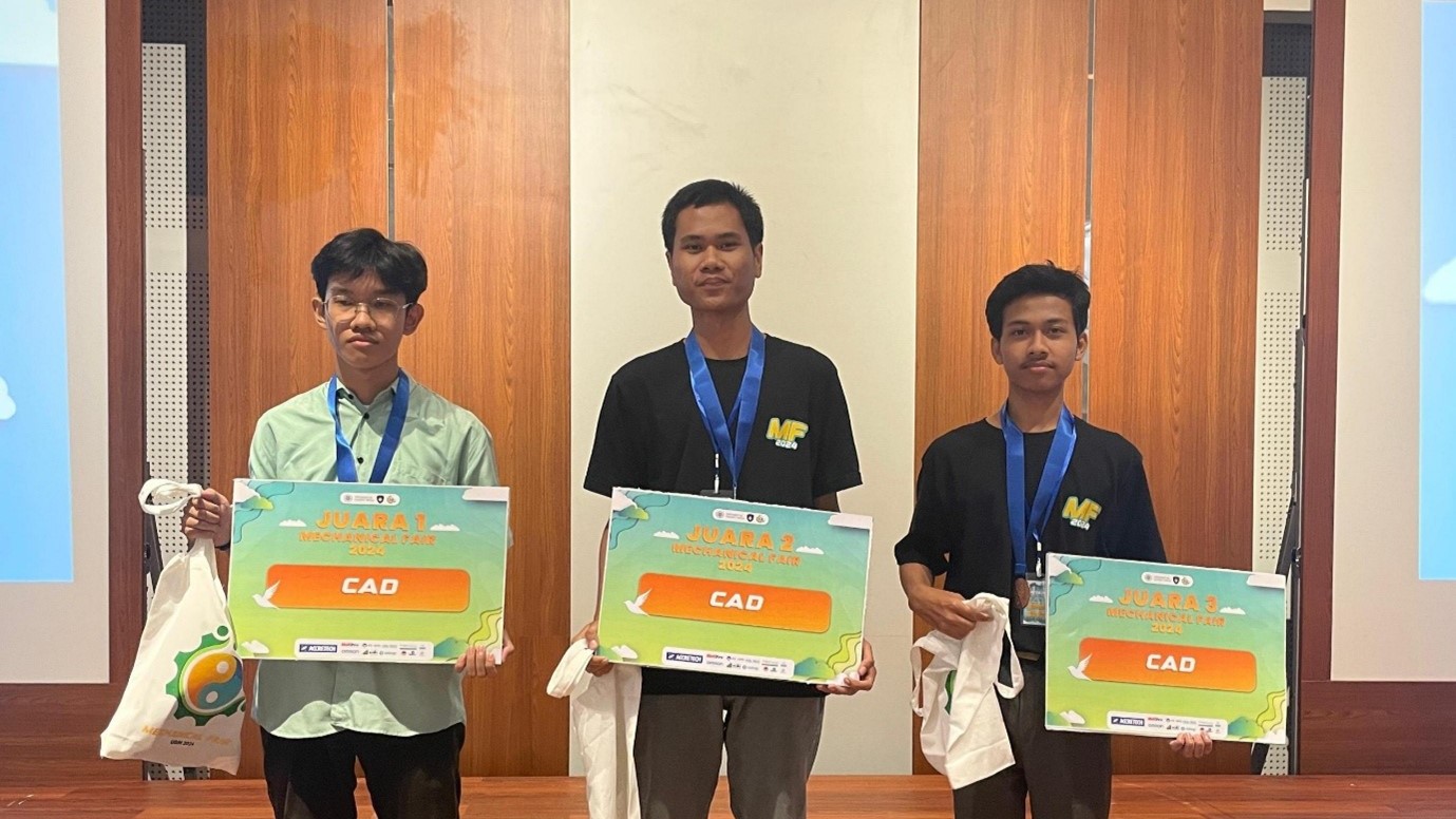 Babak Final Lomba CAD Mechanical Fair tingkat nasional digelar Universitas Gadjah Mada (UGM) pada 7-8 Mei 2024. Smk Negeri 1 Semarang berhasil meloloskan 4 wakilnya dari 15 peserta. Setelah melalui proses yang panjang, akhirnya Sabda Syahputra ditasbihkan memperoleh Juara 2. Adapun Juara 3 diraih oleh Stefanus Afarel perwakilan dari Smk Negeri 1 Semarang pula. Ke-empat perwakilan SMK Negeri 1 Semarang dibimbing oleh Pak Lis Prasetyo S.Pd.,M.T.